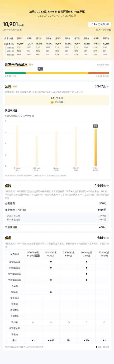在用车成本方面,根据估算,这辆车的年均综合用车成本约为1.1万元左右。这项数据没有具体的品牌和车型是无法实际运用的,因为用车成本和车主的用车场景和用车强度有着直接关系。所以这项费用具体多少钱,还是要看车辆的实际使用情况而定。