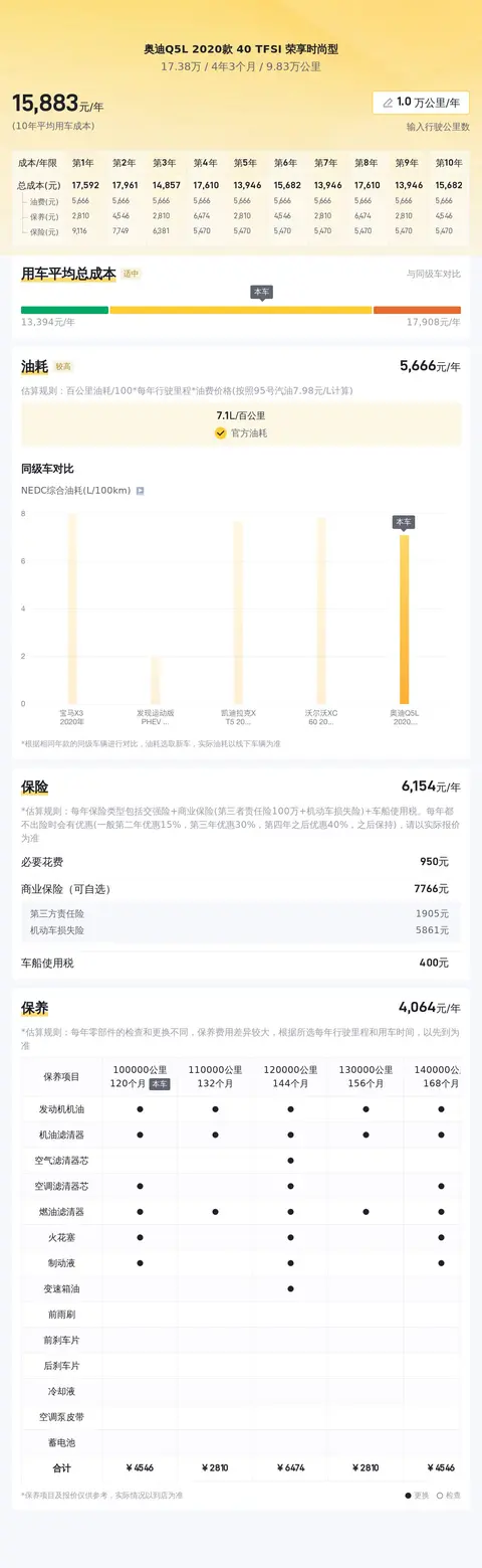 用车成本方面,该车的年均综合用车成本约为1.6万元,与同级别车型相比,其燃油经济性和保养成本都表现出较好的竞争力。此外,本车目前售价17.38万,预计再行驶2年后可卖14万,约折价18.8%,保值率还是不错的。