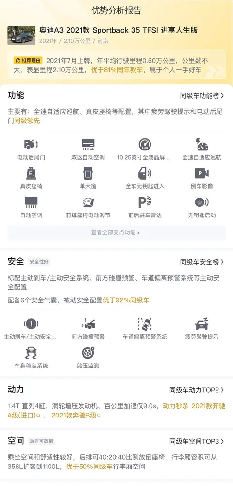 综上所述的新车含税价、用车成本、市场行情、优势分析、同款比价等数据仅供参考。在配置部分,因为二手车非标品,车辆可能会存在配置改装的情况,具体车况信息需要线下结合车辆实际情况进行综合参考。