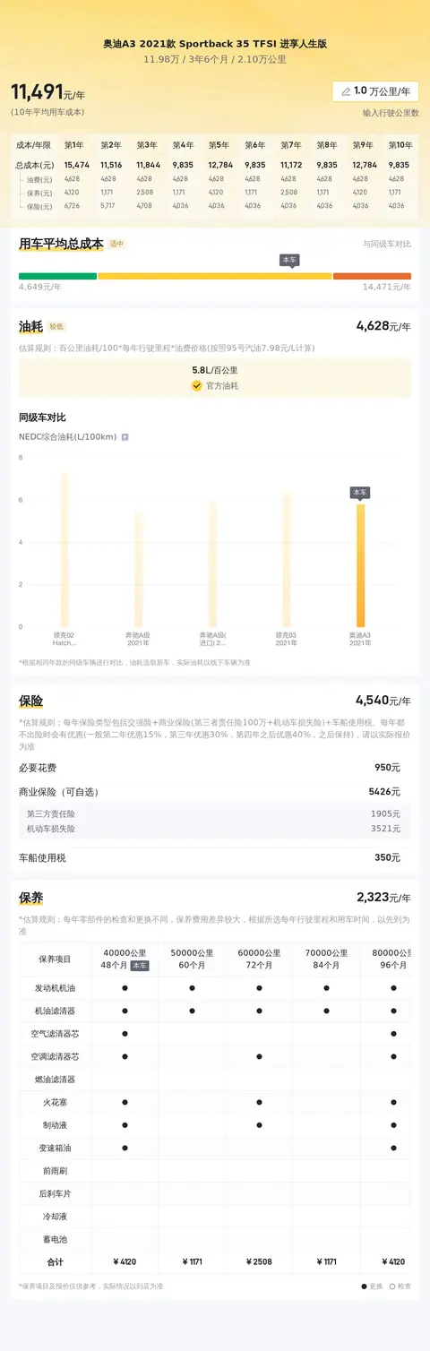 当然,买车不只是买车价,还有后期的用车养车成本。经过懂车帝的大数据分析,这辆车的10年平均用车成本大约在11443元/年,在同级别车型里面处于适中的水平。