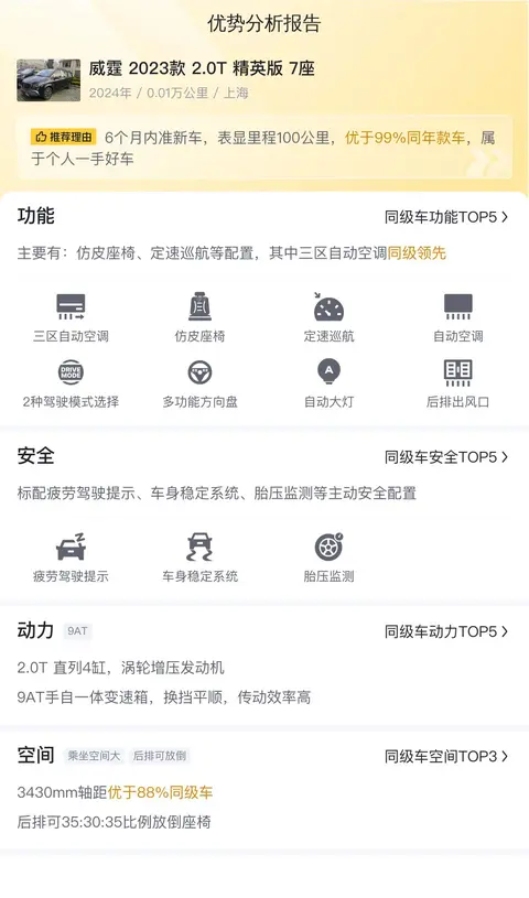 综上所述的新车含税价、用车成本、市场行情、优势分析、同款比价等数据仅供参考。在配置部分,因为二手车非标品,车辆可能会存在配置改装的情况,具体车况信息需要线下结合车辆实际情况进行综合参考。