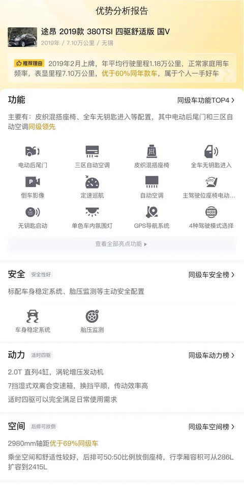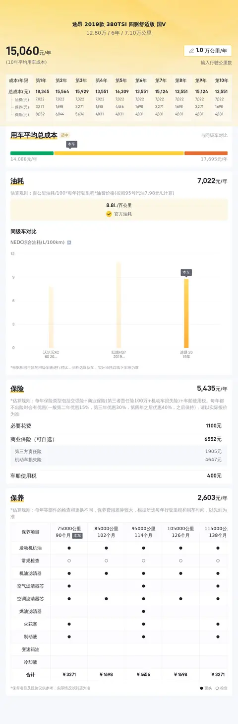 据估算,同级车的最低用车成本是12463元/年,最高是18372元/年,而这辆途昂 2019款 380TSI 四驱舒适版是14510元/年,所以用车成本适中。