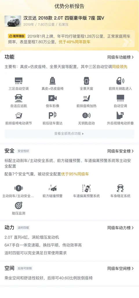 综上所述的新车含税价、用车成本、市场行情、优势分析、同款比价等数据仅供参考。在配置部分,因为二手车非标品,车辆可能会存在配置改装的情况,具体车况信息需要线下结合车辆实际情况进行综合参考。