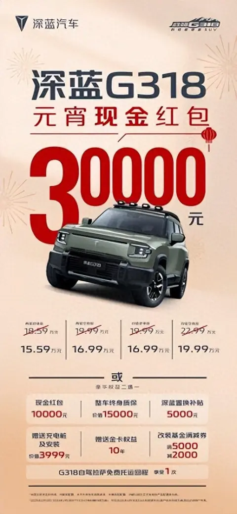 从官方渠道了解到,为了回馈广大用户,深蓝G318特别推出了大力度优惠政策。用户可以选择领取高达3万元的现金红包,或者享受回收置换补贴、整车终身质保、改装基金、10年金卡权益以及拉萨托运回城服务等权益,这些权益的总价值超过3万元。购买深蓝G318用户可以根据自己的实际需求自由选择其中一套方案,需要权益的用户也可以继续下单享受相应的优惠。
