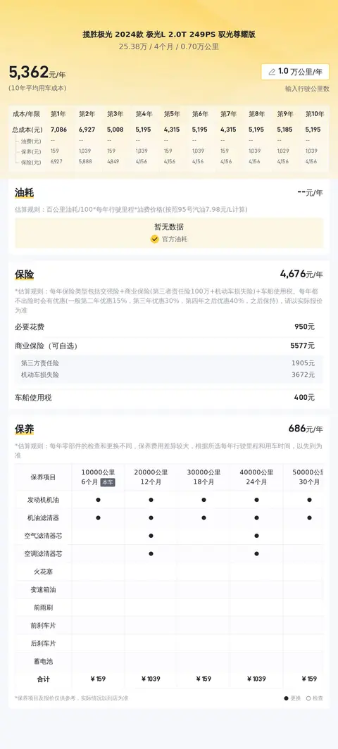 揽胜极光 2024款 极光L 2.0T 249PS 驭光尊耀版每年的用车平均总成本大约是13741元,毕竟是豪华车,这个花费属于正常水平。