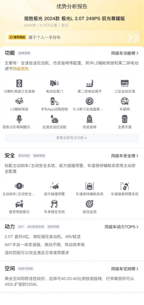 综上所述的新车含税价、用车成本、市场行情、优势分析、同款比价等数据仅供参考。在配置部分,因为二手车非标品,车辆可能会存在配置改装的情况,具体车况信息需要线下结合车辆实际情况进行综合参考。