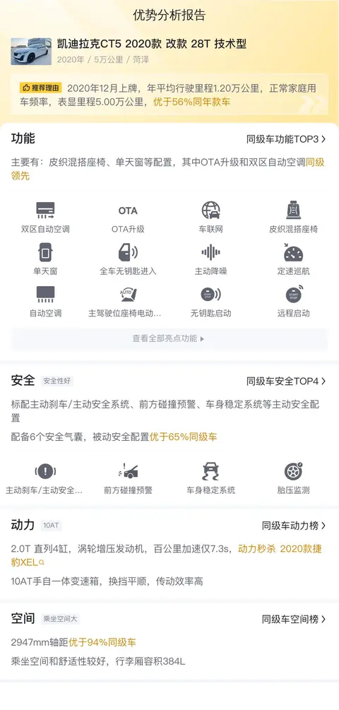 综上所述,这辆二手凯迪拉克CT5 2020款 改款 28T 技术型在车况、配置、动力性能等方面均表现出色,是一款值得考虑的二手车选择。然而,其较高的用车成本可能是潜在买家需要关注的一个方面。在做出购买决策之前,建议消费者根据自身经济实力和用车需求进行综合评估,以确保选择最适合自己的车辆。