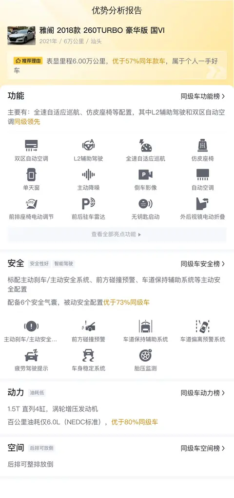 综上所述的新车含税价、用车成本、市场行情、优势分析、同款比价等数据仅供参考。在配置部分,因为二手车非标品,车辆可能会存在配置改装的情况,具体车况信息需要线下结合车辆实际情况进行综合参考。