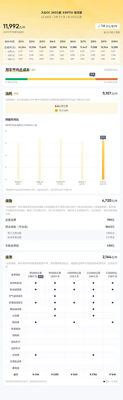 此外,同级车的最低10年平均用车成本是6533元/年,最高是14738元/年,大众CC 2021款 330TSI 炫目版是12345元/年,不算低,但也不是很高。