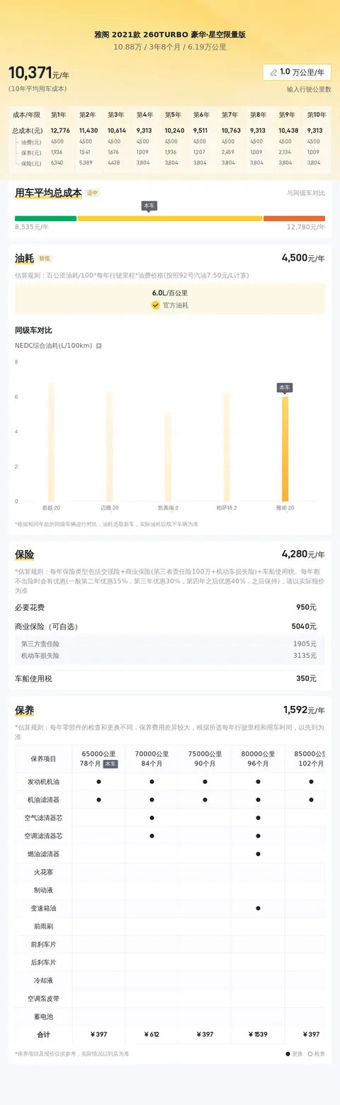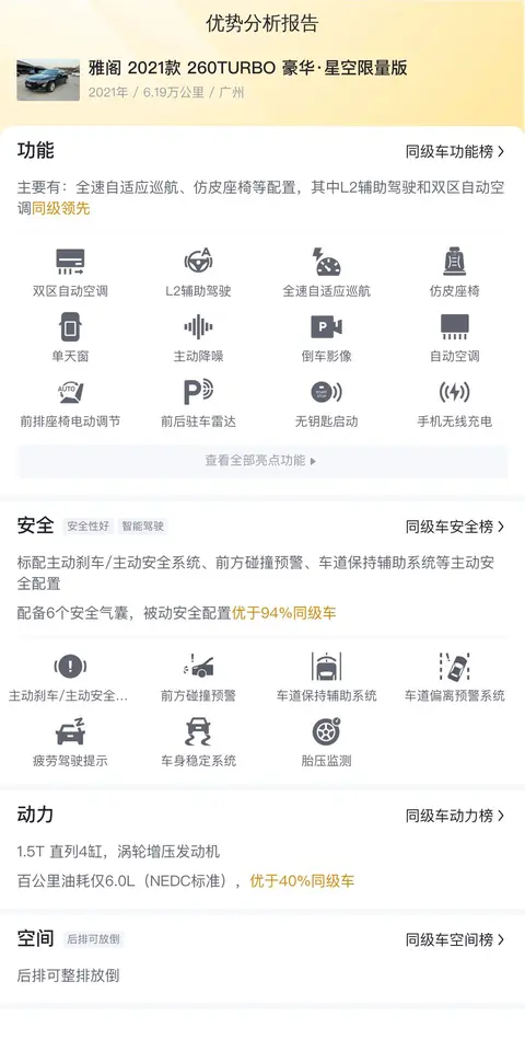 综上所述的新车含税价、用车成本、市场行情、优势分析、同款比价等数据仅供参考。在配置部分,因为二手车非标品,车辆可能会存在配置改装的情况,具体车况信息需要线下结合车辆实际情况进行综合参考。