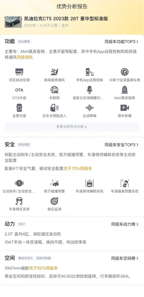 据估算,同级车的最低用车成本是6506元/年,最高是15766元/年,凯迪拉克CT5 2023款 28T 豪华型标准版是13137元/年,所以用车成本也较高。