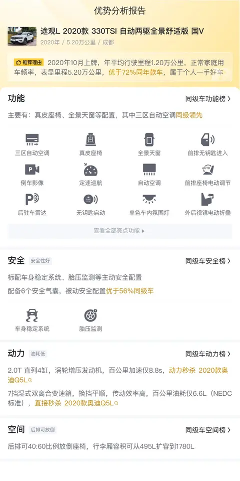 综上所述,这辆途观L 2020款330TSI自动两驱全景舒适版在车况、配置和价格方面均表现出一定的吸引力。然而,由于没有提供车辆检测报告,潜在买家在做出购买决策之前,建议您实地查看,以确保车辆的实际状况符合个人期望和需求。