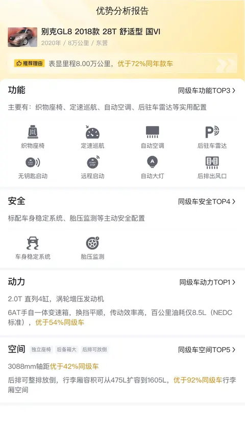 综上所述,这辆别克GL8 2018款 28T 舒适型 国VI是一款集成熟稳重、宽敞舒适、实用配置和出色动力于一身的二手MPV。它不仅有着良好的车况和合理的售价,还有着较高的保值率和较低的使用成本。如果你正在寻找一款既能满足家庭出行又能应对商务接待需求的MPV车型,那么这辆二手GL8无疑是一个值得考虑的选择。但需要注意的是,该车目前未提供第三方检测报告,潜在买家在购买前应当进行全面的检查和评估,以确保车辆的实际状况符合个人期望和需求。