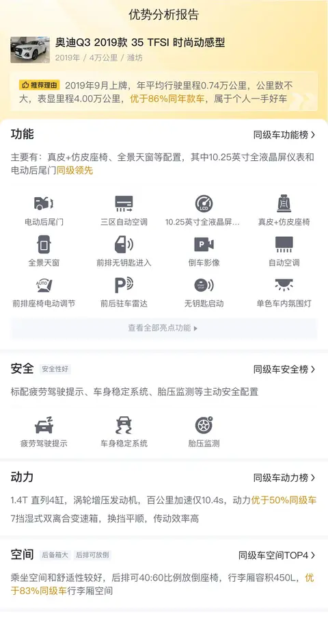 这辆奥迪Q3 2019款 35 TFSI 时尚动感型上牌时间为2019 年 9 月,上牌地及车源地均为潍坊,车身颜色为白色,当前表显里程为 4 万公里,新车指导价为 28.68 万,二手车报价为 12.7 万,过户次数为 0 次。车辆符合国 VI 排放标准,可在全国范围内上牌使用。