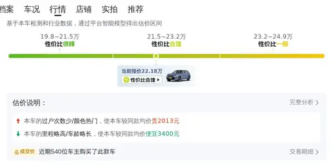 目前这辆车的市场行情价在21.23万-25.47万之间,具体售价因车况而有所不同。我们暂且把上文那辆宝马X3的车况情况代入进去,看看它的售价应该在什么范围合理,评估显示,它的售价应该在22.61万左右,当然,市场价和成交价是有差异的,最终还要看车子在谁手里,以及如何拍卖。