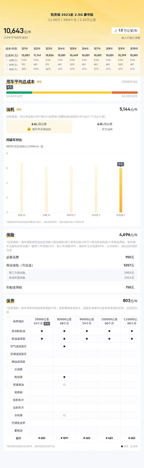 据估算,同级车的最低用车成本是6506元/年,最高是13461元/年,凯美瑞 2021款 2.5G 豪华版是11135元/年,用车成本适中,不占优势。