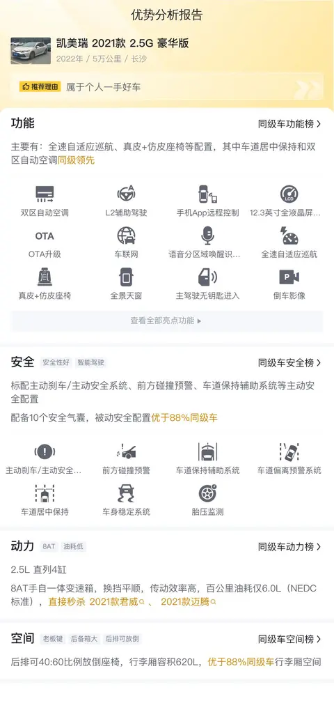 在不查看车辆实况的情况下,单纯分析各种数据,是不足以了解一辆二手车的。为了帮助您更全面地认识这款凯美瑞2021款2.5G豪华版二手车,我们简单总结了一些车辆信息。首先,从价格角度看,该车目前售价为13.98万元,相较于新车指导价而言,具有一定的性价比。其次,在配置方面,该车配备了全速自适应巡航、真皮+仿皮座椅、车道居中保持、双区自动空调等,其中车道居中保持和双区自动空调在同级别车型中处于领先地位。在动力方面,该车搭载的2.5L直列4缸发动机和8AT手自一体变速箱表现出色,其百公里油耗仅为6.0L(NEDC标准),在对比2021款君威、2021款迈腾等竞品车型时,具有明显优势。在空间方面,该车后排座椅支持40:60比例放倒,行李厢容积为620L,优于88%同级别车型。最后,在价格影响因素方面,该车的里程数和车龄均高于市场均值,而过户次数低于市场均值,这些因素都会对车辆售价产生一定影响。