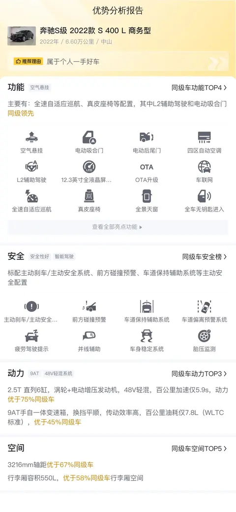 今天我们要介绍的这款奔驰S级2022款 S 400 L商务型,上牌地、车源地均在广东中山,上牌时间为2022年7月,表显里程6.6万公里,黑色车身,新车指导价91.78万,二手车报价64.98万,过户次数0次。
