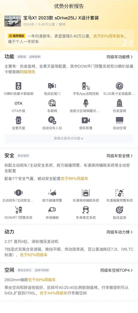 这款宝马X1 2023款 sDrive25Li X设计套装在百公里油耗、百公里加速、轴距以及行李舱容积等方面均表现出色,优于大多数同级别车型。特别是在百公里油耗方面,其WLTC综合油耗仅为7.2L,优于62%的同级别车型,为驾驶者节省了燃油成本。在百公里加速方面,宝马X1 2023款 sDrive25Li X设计套装的官方0-100km/h加速时间为7.9秒,优于57%的同级别车型,让驾驶者能够享受到流畅而有力的加速体验。在轴距方面,宝马X1 2023款 sDrive25Li X设计套装的轴距达到了2802mm,优于89%的同级别车型,为乘客提供了宽敞的乘坐空间。在行李舱容积方面,宝马X1 2023款 sDrive25Li X设计套装的行李舱容积为540-1700L,优于44%的同级别车型,让驾驶者能够携带更多的行李和物品。所有这些优势都使得宝马X1 2023款 sDrive25Li X设计套装成为了一款集性能、舒适性和实用性于一身的优秀车型。