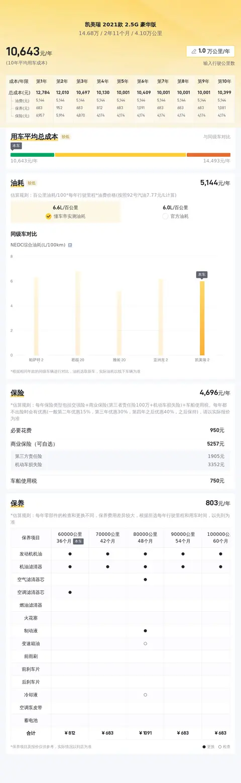 在用车成本方面,根据估算,这辆凯美瑞的年均综合用车成本大约为1.1万元左右。这一成本在同级别车型中属于合理范围,包括油费、保养费和保险费等日常开支。值得注意的是,实际费用可能会根据车主的驾驶习惯、地区差异和市场波动等因素有所变化。