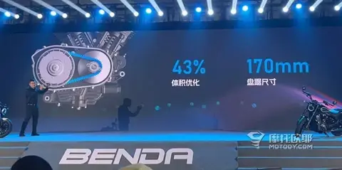 关于强混系统,奔达现场并未透露太多内容,只说了句将适用于350cc以上排量,个人推测,既然已经叫做强混系统,那这套系统的预估电压将≥48V,车型图片上也为动力电池规划好了位置,具体形式大概率和汽车一样,在起步和加速阶段,由电池推动电机/启动电机,带来更加平顺/强力的驾驶体验。