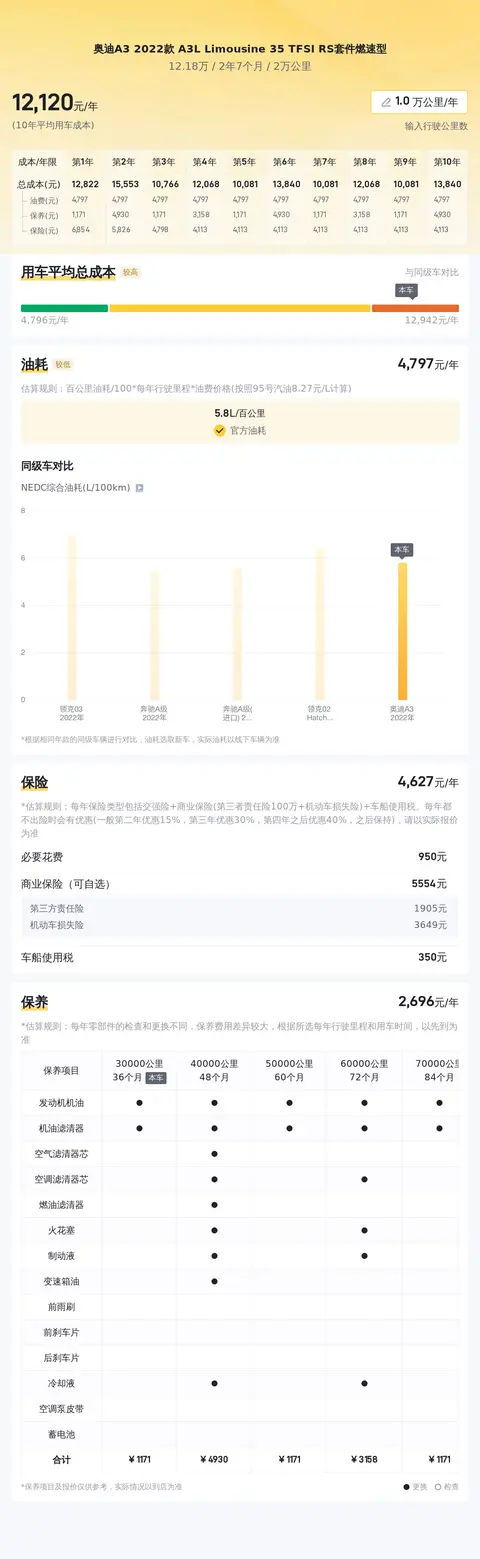 在用车成本方面,根据估算,奥迪A3 2022款 A3L Limousine 35 TFSI RS套件燃速型的年均综合用车成本约为1.2万元左右,这包括了油费、保养费、保险费等日常用车开支。值得注意的是,这项费用会根据实际使用情况和市场价格波动有所变化。