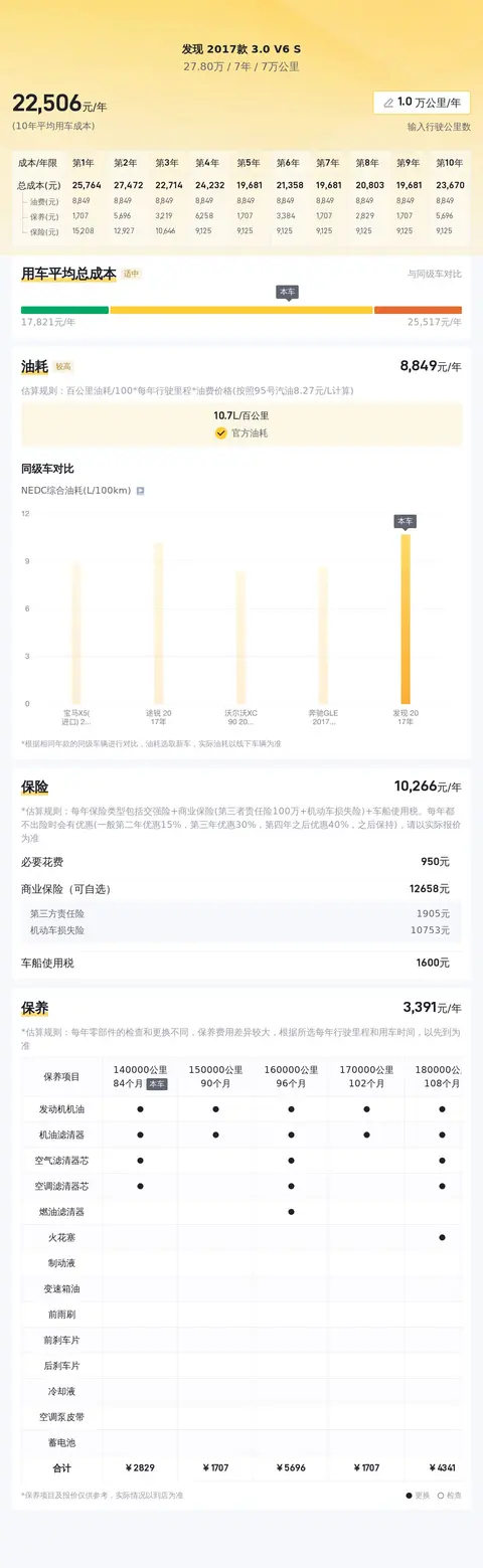 对于二手车而言,用车成本也是大家必须考虑的一项重要指标,这辆车的10年平均用车成本大概是23578元/年,这项花销具体高不高,还需要结合您当地的物价水平和消费习惯而定。