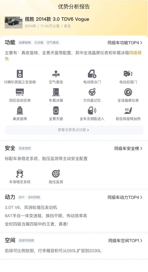 综上所述,揽胜 2014款 3.0 TDV6 Vogue是一款集豪华与性能于一体的二手车选择。尽管存在一些潜在的缺点,但只要在购买前进行充分的检查和评估,这款车仍然能够为车主带来优质的驾驶体验和舒适的乘坐感受。需要注意的是,由于这款车没有检测报告,因此在购买前一定要亲自查看车辆的实际状况,并结合车辆的实际情况进行综合考虑。