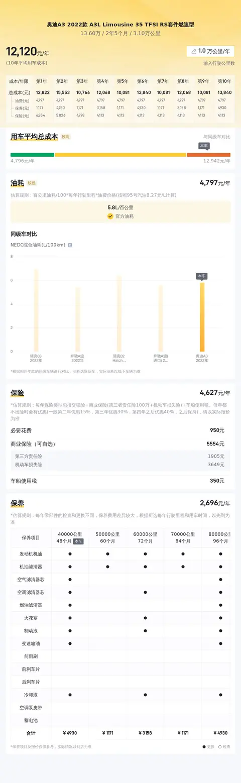 这辆车年均综合用车成本大概在每年1.2万元左右,实际费用开销会根据车主的使用情况而变动。