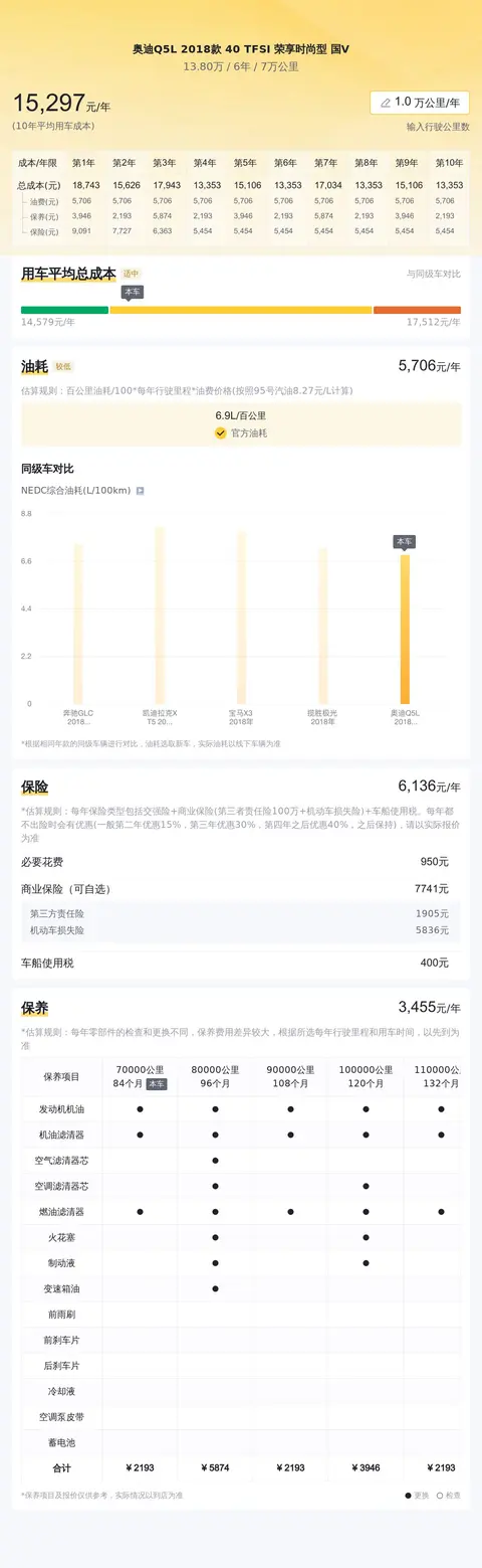 在用车成本方面,根据相关数据显示,这款奥迪Q5L的年均综合用车成本大约为1.5万元左右。需要注意的是,实际费用支出会随着车主的具体使用情况和维护习惯而有所浮动。