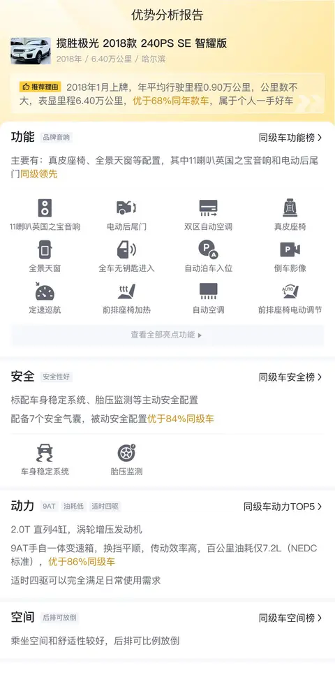 这辆揽胜极光 2018款 240PS SE 智耀版在配置、动力、驾乘感受等方面都表现不错,尤其值得一提的是英国之宝音响和电动后尾门,在同级别车型中具有一定的竞争优势。