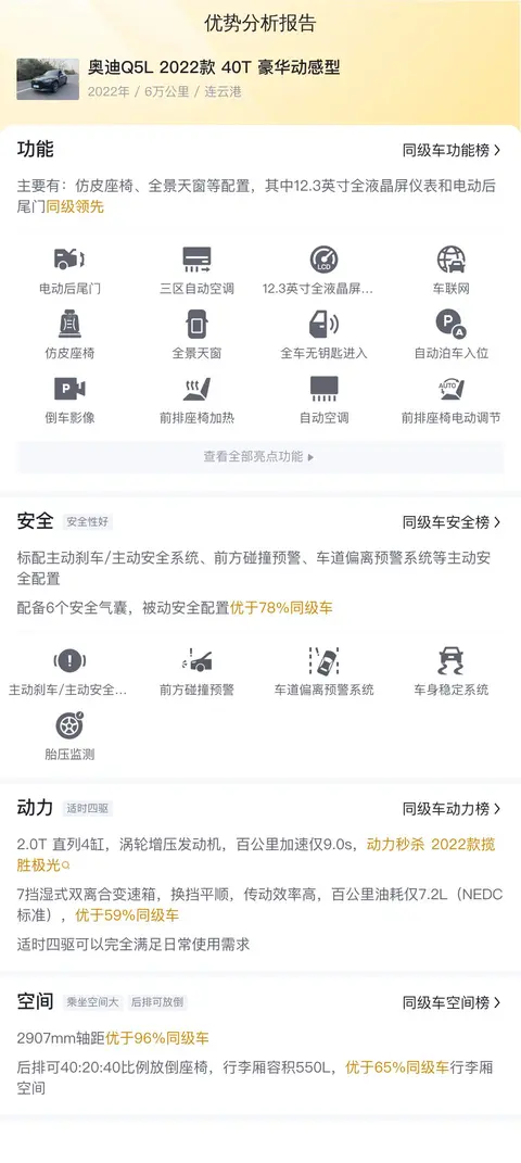 综上所述,奥迪Q5L 2022款 40T 豪华动感型在配置、动力、空间等方面表现出色,尤其在科技配置和舒适性配置上优于多数同级车。然而,其内饰材质和隔音效果仍有提升空间。在选购时,建议您综合考虑个人需求、预算以及车辆的实际状况。如果您重视科技体验和舒适性,并且预算充足,奥迪Q5L 2022款 40T 豪华动感型是一个不错的选择。但如果您更注重性价比或有其他的特定需求,可能还需要考虑其他车型。最后,提醒您在购车过程中一定要选择正规的渠道和商家,尽量索取或查看车辆的第三方权威检测报告,确保所购车辆的品质和安全性。