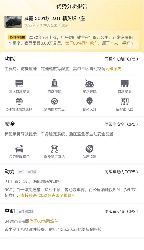 优势方面,这辆威霆 2021款 2.0T 精英版 7座的轴距是3430mm,优于50%同级车,乘坐空间和舒适性较好。后排可35:30:35比例放倒座椅,优于50%同级车,行李厢容积较大,全家出行无忧。