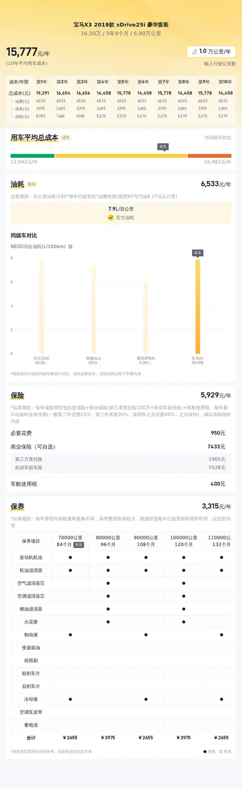当前市场上,这款车型的二手车价格大约在18.5万到23.6万元之间。当然,具体的售价会受到车辆状况等因素的影响。关于用车成本方面,根据估算,维护这辆车每年大约需要1.56万元左右。这里值得一提的是,该车的百公里油耗为7.9升,这对于一个豪华品牌车型来说,是一个相当不错的油耗表现,当然油耗具体还是要根据使用场景和驾驶习惯而有所不同。