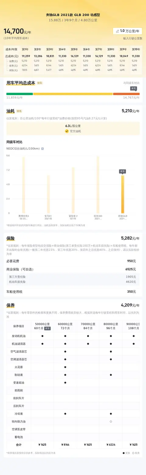 除了市场行情,我们还测量了这款车的用车成本,包含了油费、保养费、保险费,方便您全面了解持有这款车的成本。
