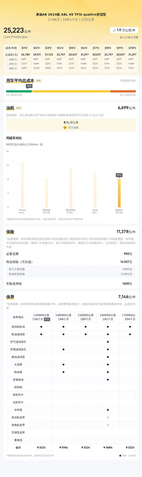 根据估算,这辆奥迪A8的年均综合用车成本约为2.5万元左右。实际费用会根据车主的使用习惯和维护程度有所变动。