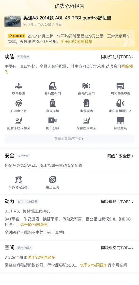 综上所述,购买二手奥迪A8 2014款 A8L 45 TFSI quattro舒适型是一个兼具性价比和品质的选择。其合理的价格、卓越的性能、舒适的乘坐体验和先进的智能科技使其成为豪华轿车市场的佼佼者。然而,车况的详细了解成为买家做出决策的关键。建议您亲自查看车辆,亲身感受其魅力所在。同时,也可以找懂车帝的专业验车师进行车况检测,让您买的放心,用的安心。