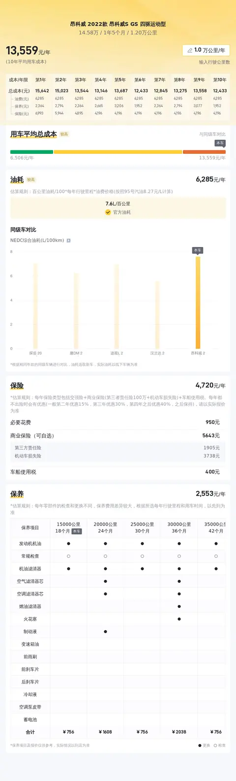 根据相关数据,昂科威 2022款 昂科威S GS 四驱运动型的百公里油耗约为7.6L,年保险费用约4200元,年保养费用约2300元。考虑到各种因素的影响,实际费用可能会有所不同。本车的十年平均用车成本估算为13668元/年。