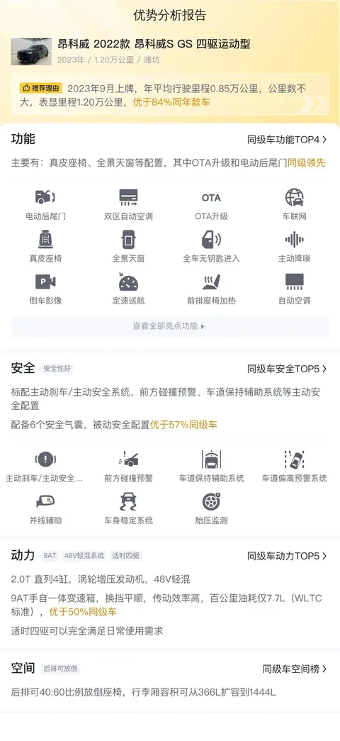 综上所述的新车含税价、用车成本、市场行情、优势分析、同款比价等数据仅供参考。在配置部分,因为二手车非标品,车辆可能会存在配置改装的情况,具体车况信息需要线下结合车辆实际情况进行综合参考。
