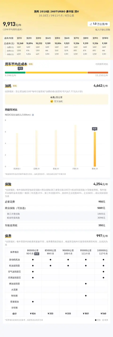 用车成本上,根据懂车帝对雅阁 2018款 260TURBO 豪华版 国V这款车型的分析,它的10年平均用车成本大约在10,180元/年,这一数字在同级别车型中处于适中的水平。这一用车成本涵盖了燃油、保养、保险以及其他相关费用等方面的支出,为消费者提供了一个全面而准确的成本预估。当然,实际用车成本还是会根据车主的使用习惯、驾驶方式以及车辆维护状况等因素有所变动。