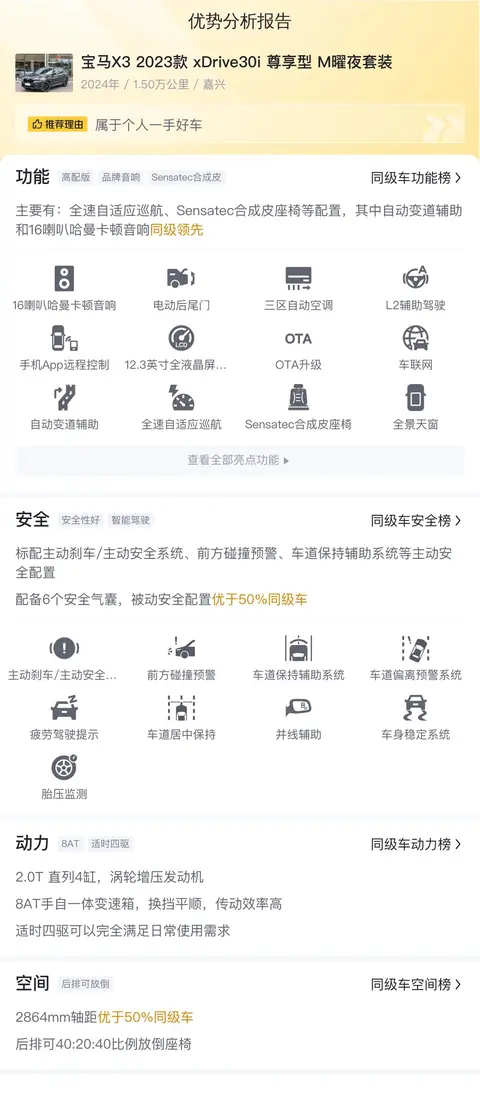 综上所述,这辆宝马X3 2023款 xDrive30i 尊享型 M曜夜套装是一款集豪华、舒适、动力于一身的二手车。无论是从外观内饰的维护状况,还是从车辆配置与性能表现来看,它都展现出了宝马品牌的实力和魅力。当然,在购买二手车时,我们也需要关注一些细节问题。比如,车辆的实际行驶里程、保养记录、是否有重大事故历史等。只有全面了解了这些信息,我们才能做出更加明智的购买决策。