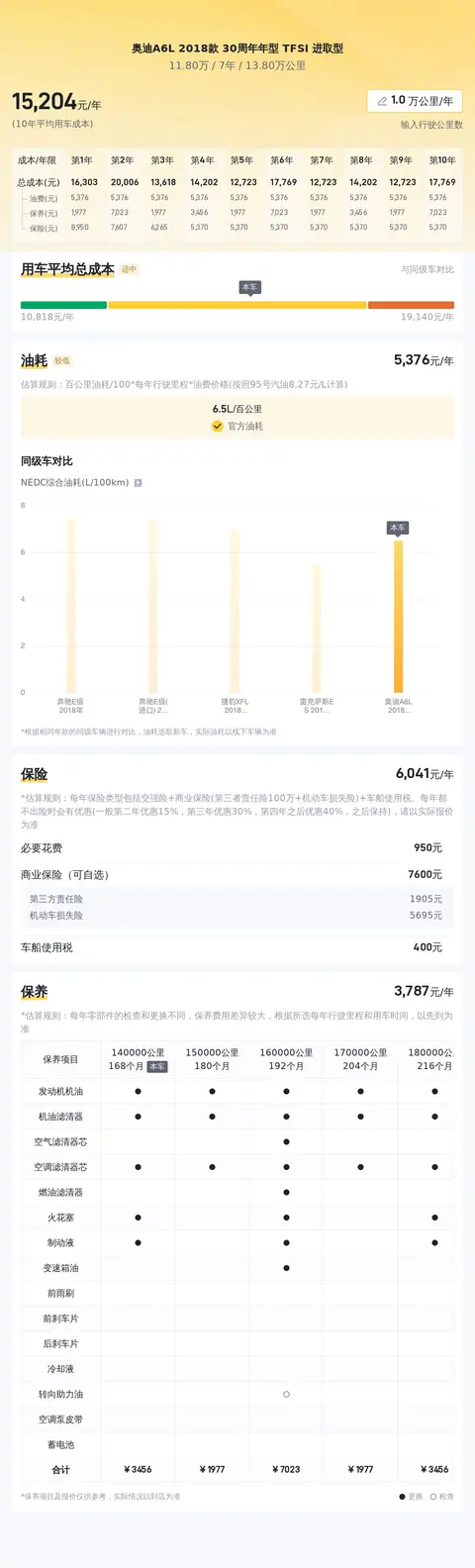 关于用车成本,根据估算,这辆奥迪 A6L 的年均综合用车成本大约为 1.5 万元。具体金额还需根据车辆实际使用情况和车主的驾驶习惯而定。