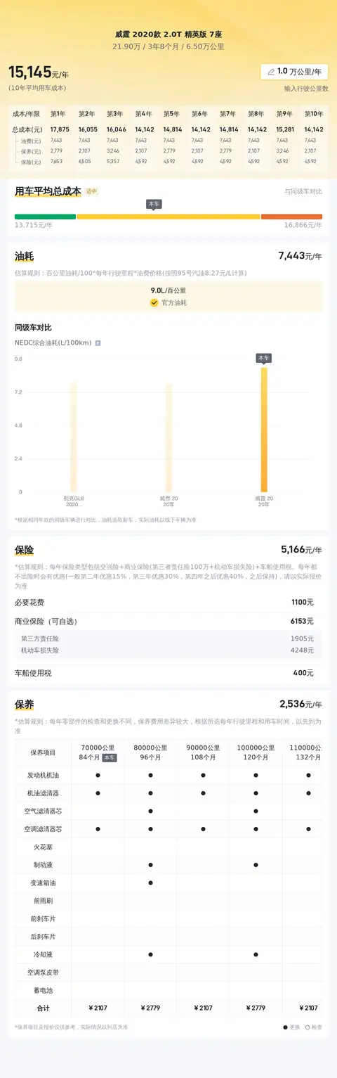 而在用车成本部分,我们暂且按照每年2万公里的行驶里程计算,大约一年的用车成本在23000元左右,当然具体用车成本金额还是根据车辆的实际使用情况而决定的。