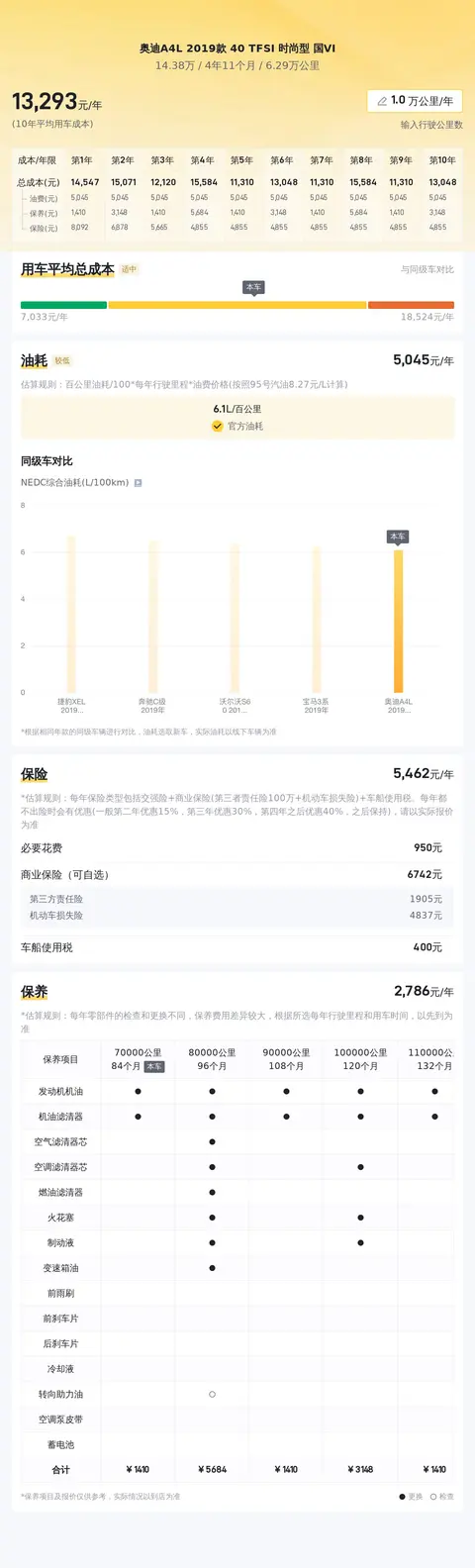 这辆二手奥迪A4L的年均综合用车成本大约为1.3万元左右,这项开支具体金额跟车主的驾驶习惯和行车环境有直接关系。