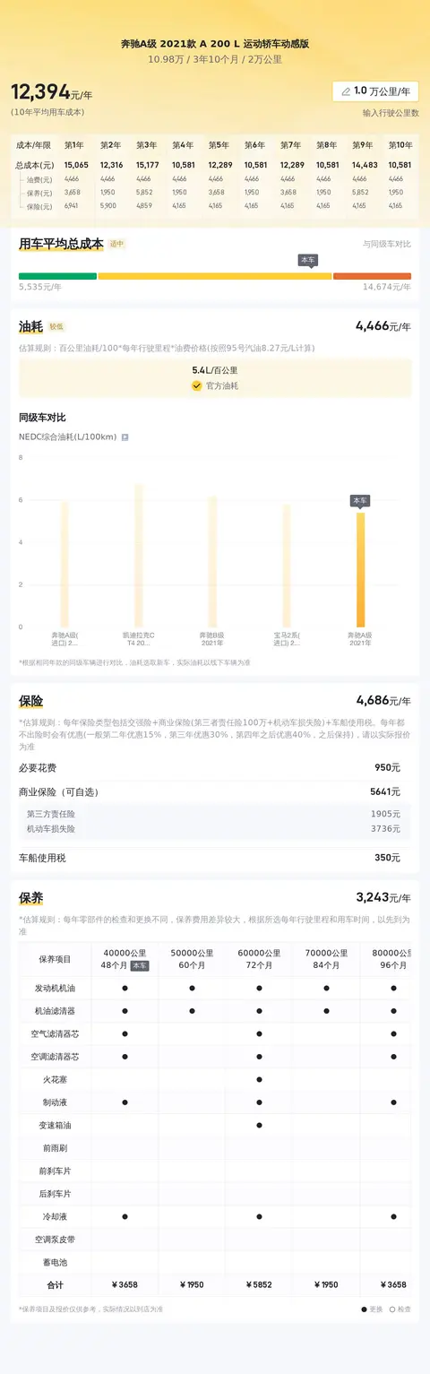 目前这款二手奔驰A级的价格在全国市场处于较低的水平,是一个入手的好时机。关于用车成本方面,该车官方公布的百公里油耗为5.4升,按照每年行驶2万公里计算,每年的油费约为4320元。此外,保险费用每年约4631元,保养费用每年约3175元,这些费用都属于正常的用车开支范围之内。