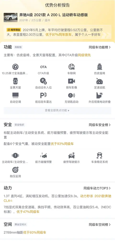 奔驰A级(图片|配置|询价)作为德国豪华汽车制造商奔驰的一款紧凑型豪华轿车,自1997年首次亮相以来,经历了多次迭代和发展,逐步成为了奔驰产品线中的重要一员。最初设计旨在提供城市驾驶便利性和安全性,随着时间推移,A级车不断融入更多先进技术、动力系统及豪华配置,以适应市场需求的变化及消费者偏好。今天我们就为您带来一辆二手奔驰A级,具体版本为——奔驰A级 2021款 A 200 L 运动轿车动感版。
