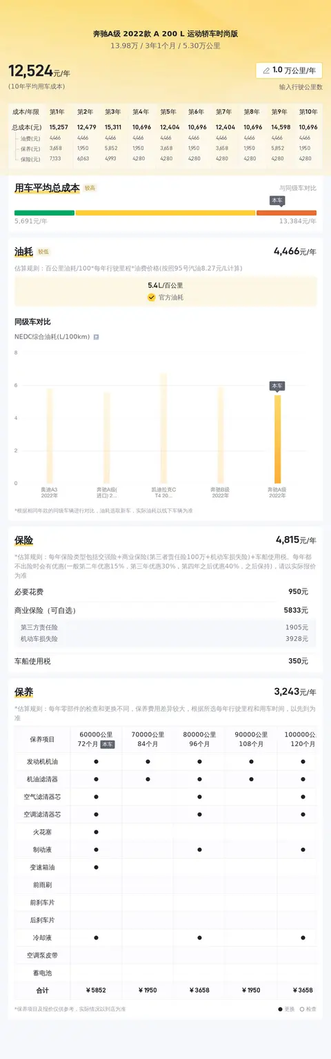 在用车成本方面,通过综合考量油耗、保险与保养费用,我们估测这辆奔驰A级的年均使用成本大约为1.3万元,这一数字对于一款豪华品牌车型而言,可谓相当经济。