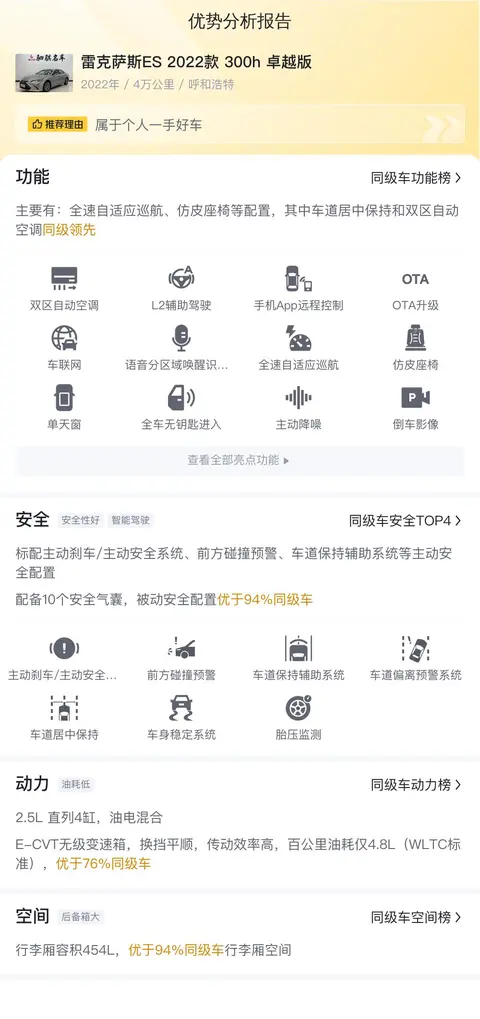 综上所述,这辆二手雷克萨斯ES 2022款 300h 卓越版以其卓越的品质、合理的市场价格和较低的用车成本,成为寻求高端驾乘体验用户的理想选择。需要注意的是,车辆的实际状况还需结合现场查看和试驾体验来评估,确保符合个人需求和期望。