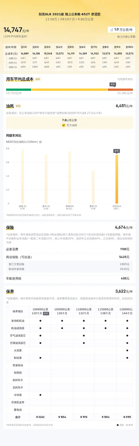 用车成本也是我们买车应该考虑的重要因素。根据估算,这辆别克GL8的年均综合用车成本约为1.5万元左右,但这会根据每个车主的具体使用情况和维护水平而有所不同。