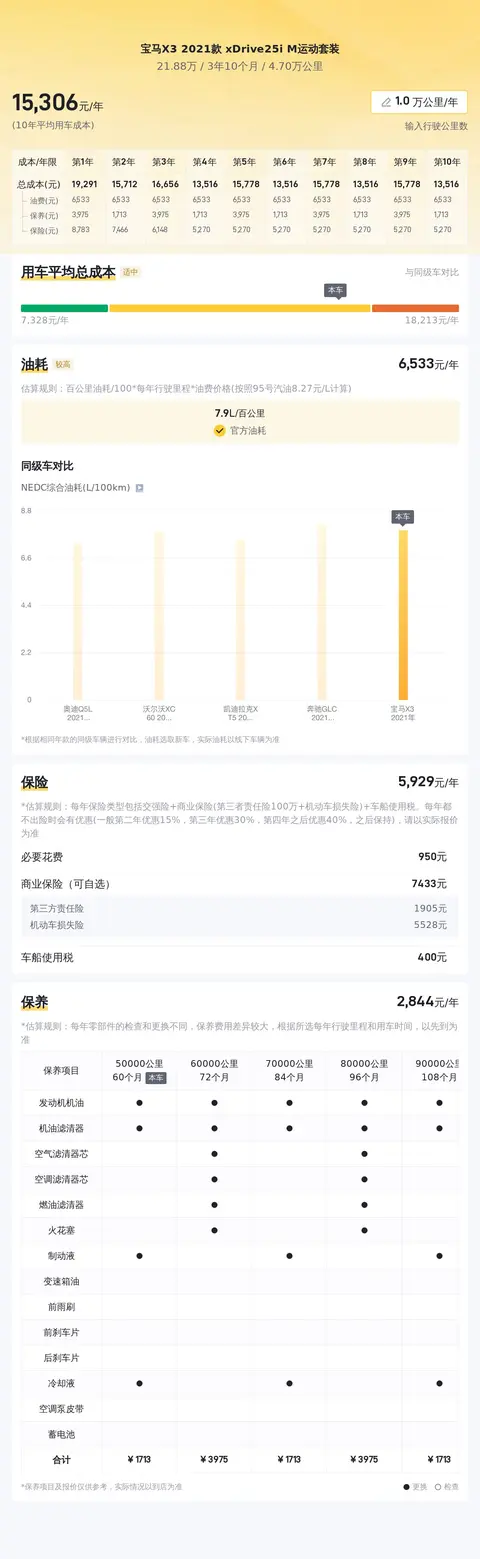 宝马X3 2021款 xDrive25i M运动套装的用车成本主要包括燃油费、保养费、保险费、维修费和洗车美容费五大类。根据估算,该车型的年均综合用车成本大约为15,557元,具体费用因地区消费水平和个人使用习惯而有所不同。接下来,我们将对各项费用进行详细解析。燃油费:按照当前油价和车辆油耗计算,每年约需6,330元(按每年行驶1万公里计算)。保养费:包括常规保养和零部件更换等费用,每年大约为3,709元。保险费:通常包括交强险、商业保险和车船使用税等,预估每年约为5,037元。维修费:考虑到车辆使用过程中的自然损耗,每年预留一定金额作为维修基金,建议每年预留500元。洗车美容费:根据个人习惯和车辆使用频率不同,每年的费用也会有所差异,建议每年预留1,000元。需要注意的是,以上费用估算仅供参考,实际费用可能因地区、使用频率、油价波动等因素而有所不同。合理规划预算,既能享受驾车的乐趣,又能避免不必要的经济压力。